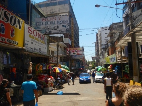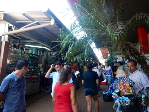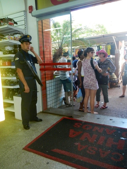 Our first day at the Falls we went to Paraguay shopping – we didn’t actually go to the Falls. Everyone was a little tired & this way we could sleep in a bit. It also meant our last day at the Falls we wouldn’t have to spend hanging around waiting for another overnight bus, we would spend it on the Brazil side of the Falls. Shopping in Paraguay was an experience, I have to be honest it was a little scary. There is no control at the border – you can just drive across. There were men with guns standing at the gates but you just keep driving. I didn’t buy anything but I certainly could have bought just about anything you could think of, including drugs. It is a culture shock. Lots of Brazilians go across the border to shop because electronics are so much cheaper so getting back across the border into Brazil is much harder. They are looking for that. Our tour guide said that sometimes people will throw things over the bridge just to avoid getting caught & having to pay. There will be someone at the bottom to catch their things.