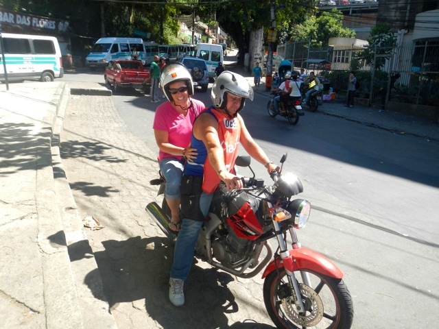 To begin the tour we took a ride on the back of a motorbike to the top of the Rocinha Favela. We didn’t know this was part of the tour – it’s our fault for not knowing but I think maybe for me it was better not knowing. I didn’t think we were going to survive that one bus ride in Peru but it was nothing like this! Racing through the streets, passing trucks & busses on blind corners and I have no idea where I am! It wasn’t a short ride either, well it felt long anyway. At first I was just worried about the speed the driver was going and whipping around the vehicles on the switchback roads but the longer it went on the more worried I was becoming that he was just going to drop me off in the middle of nowhere, I couldn’t find anyone from my group. Well, obviously I survived – I can’t count the number of times on this adventure that I have thought, “this could be it.”
