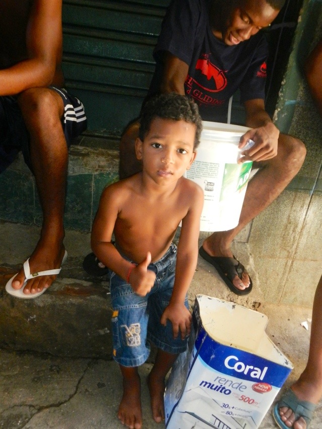 We continued to walk around, winding through tiny alleys, down wet stairs, heading down the hill. We stopped at a little store, bakery kind of place. We all bought something. How could you not support someone living in these conditions? After that we came upon a group of boys playing music & dancing. The older boys were playing with empty buckets & pails. Patrick explained that there is a Samba school that some of the kids attend so the one little boy did a small demonstration for us while the older boys played. It was fun – we all threw some money in the bucket and the little boy replied thank you in English! It was definitely a unique insight into the spirit of the people, especially the kids.