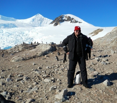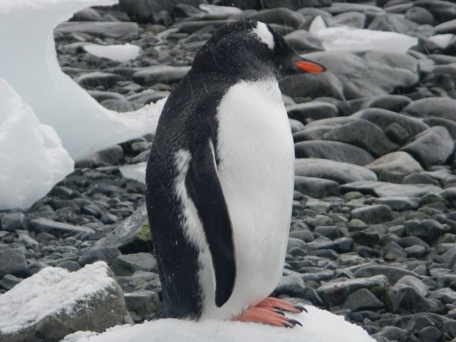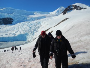 We took an excursion in the morning on the zodiacs, we went to Danco Island. It was great. Because it was so sunny we couldn’t walk too far out, it wasn’t safe to walk on the snow, we had to stay on the rocky beach. We wandered around for a while and then Jeff and I just sat down on a rock and watched a colony of Gentoo penguins. If you just sit they will come up to you – they are very curious wee creatures. It was a little mesmerizing just to watch. I took a great photo of a little wee guy that I think was going to kiss me!