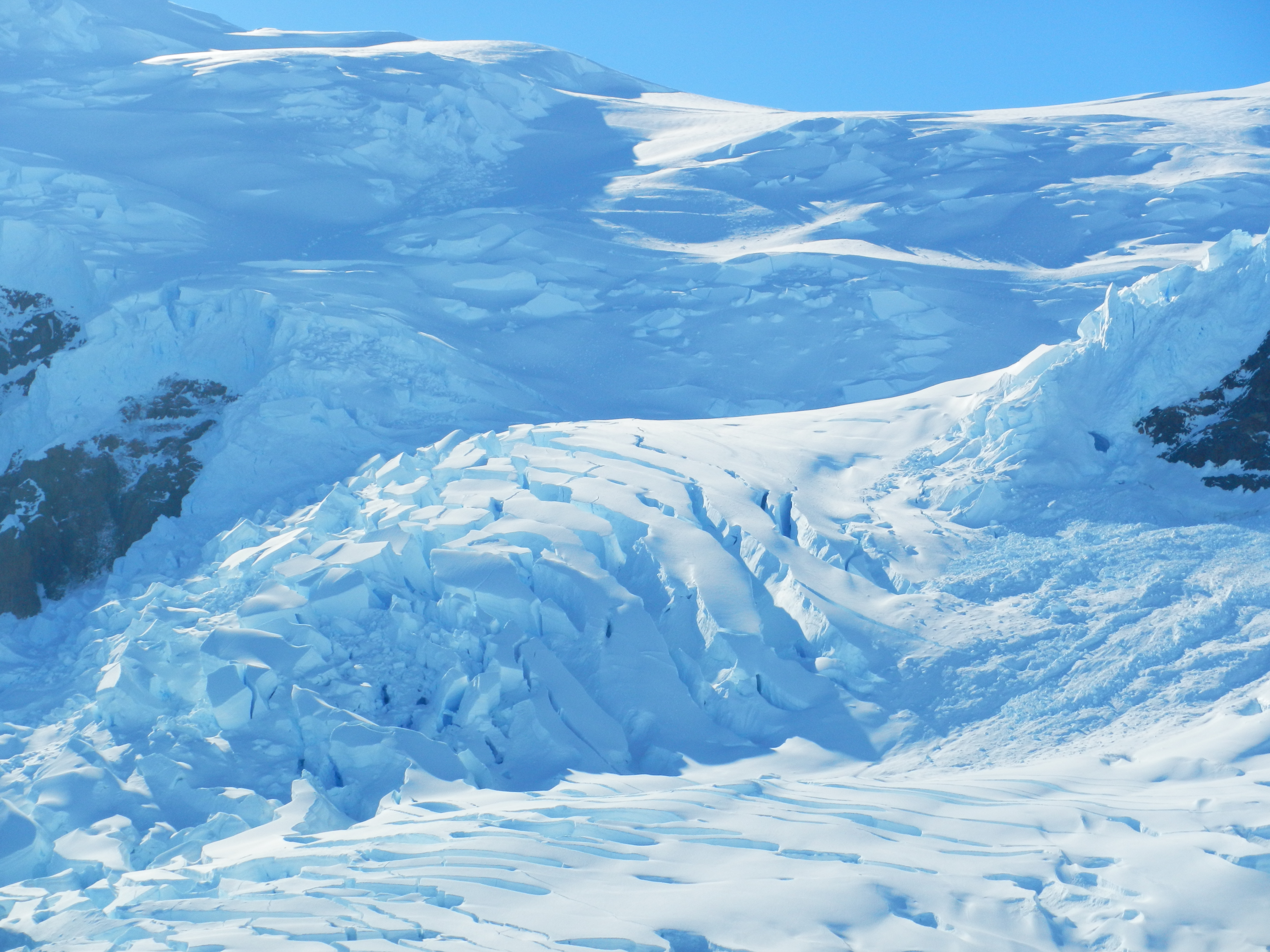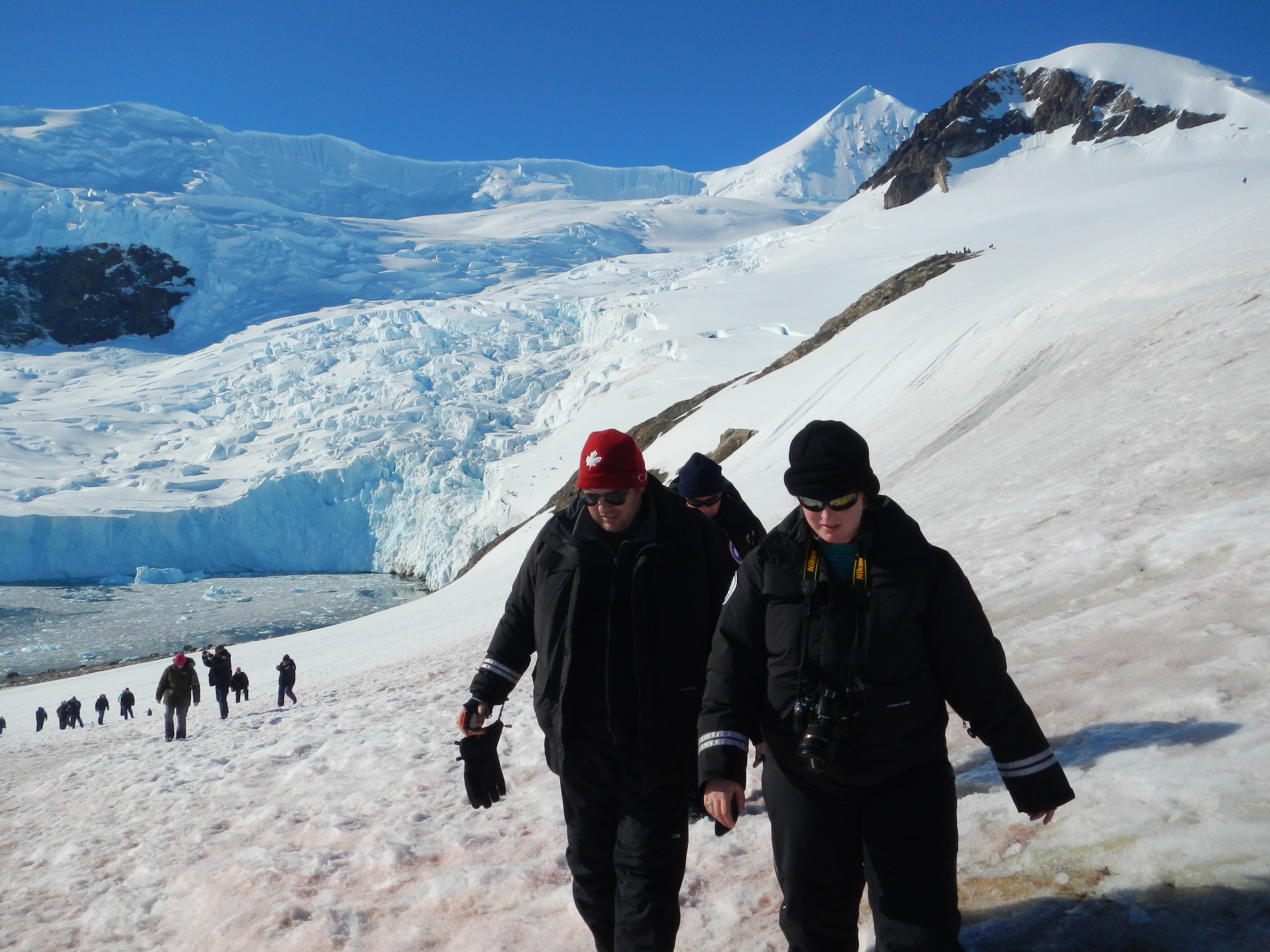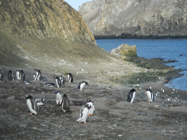 In the afternoon we went to Neko Harbour in Andvord Bay. It was such a terrific day, the temperature reached 11 degrees and the sun was out the entire time. There was a colony of Gentoo penguins a Neko Harbour as well. There were so many that you had to watch where you were walking or you could almost step on a tiny one. They seemed to enjoy playing around peoples feet. We hiked up the side of a huge hill, which is an Antarctic tradition at this particular spot. It was so hot that most of us had our coats off by the time we reached the top. The view was spectacular!!! We took some fantastic photos. You can just barely make out some people and the penguins at the bottom of the hill. The water and the ice with the sun shining so brightly was just amazing.